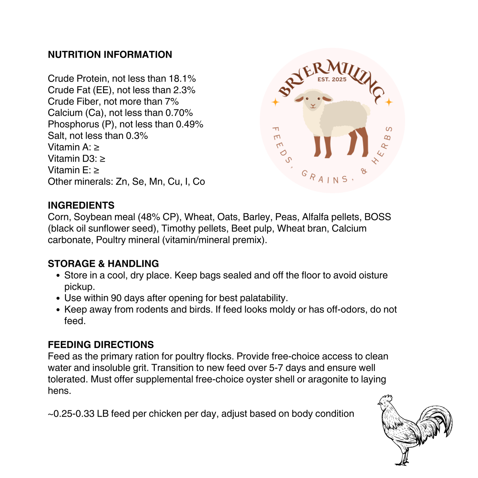High calcium diets can pose risks to non-laying poultry and roosters, leading to potential health complications such as gout or kidney issues. Bryer Milling understands the importance of managing calcium levels thoughtfully in your flock’s feed. That’s why this formula is crafted to be low in calcium, catering to non-laying poultry while safeguarding their health.