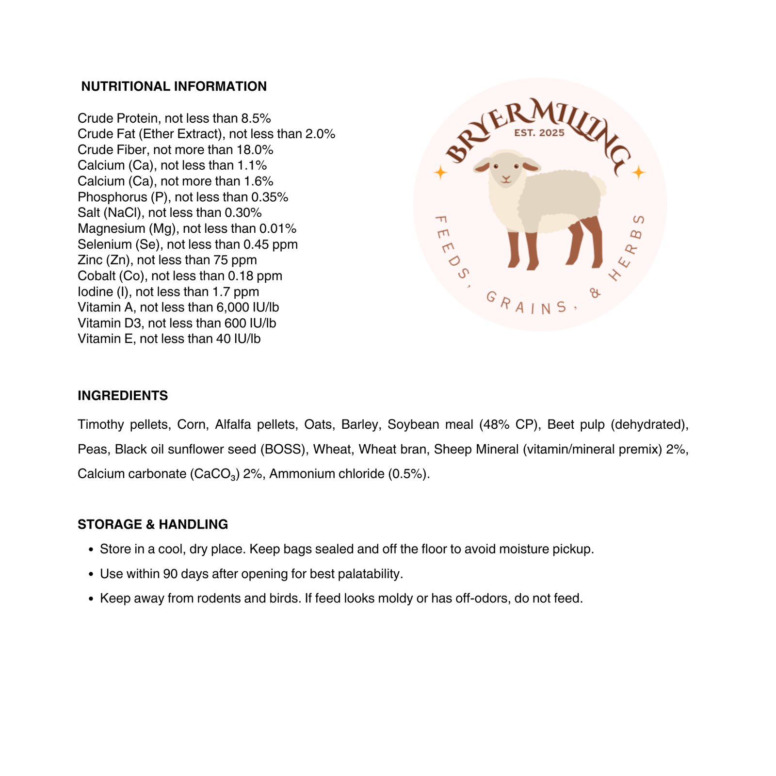 PLEASE READ: Our Sheep Flock Maintenance with added Ammonium Chloride for urinary health, conveniently priced by the pound for custom bag sizing. Set the product quantity to the amount of feed in pounds you want to purchase. Formulated to meet the nutritional needs of adult sheep.