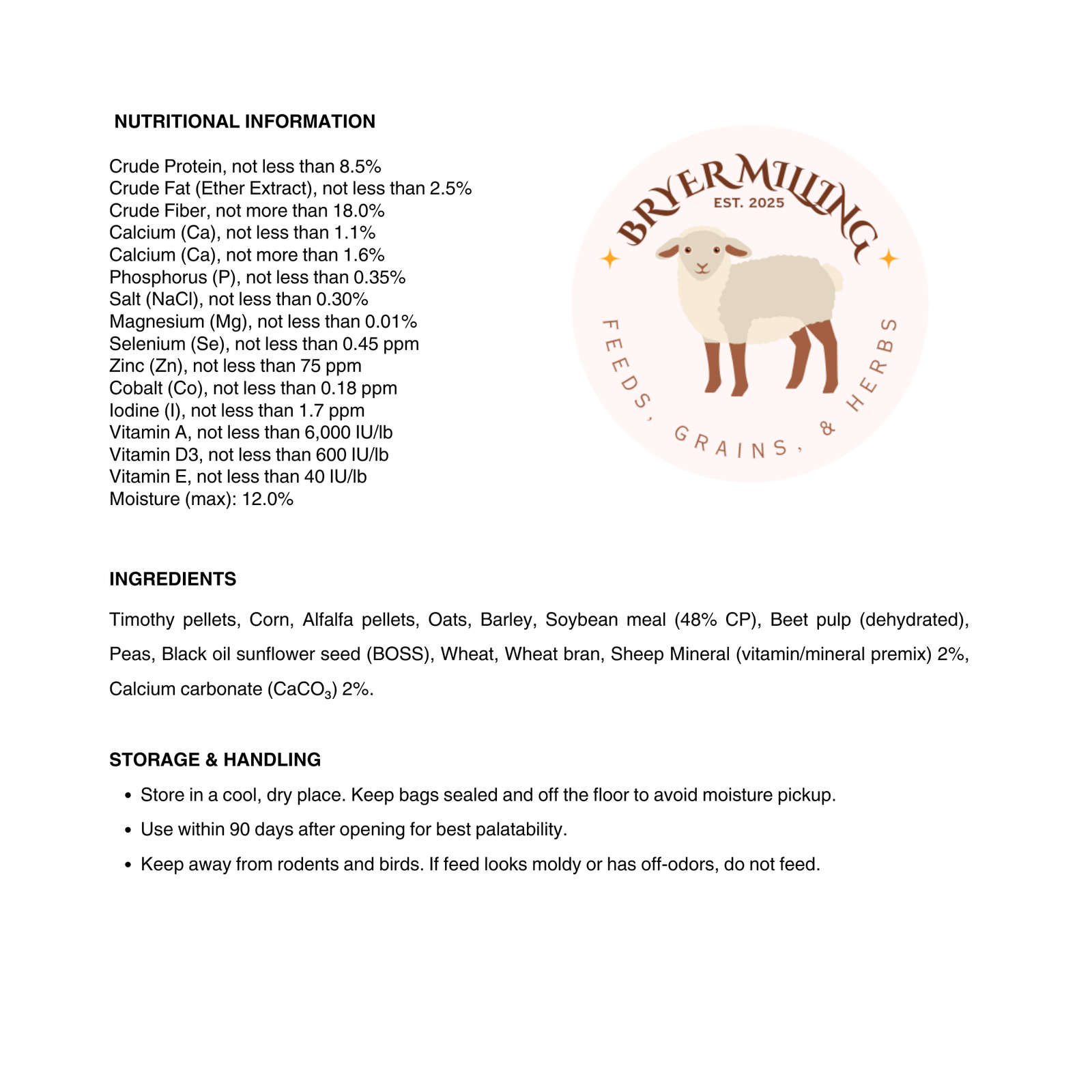 Proper mineral balance is crucial for maintaining a healthy flock, especially when managing mixed groups. Our sheep maintenance product is carefully balanced with an ideal calcium-to-phosphorus ratio. This ensures it is suitable for mixed flocks, including wethers, while minimizing any risks of health complications caused by improper mineral nutrition. With Bryer Milling, you can trust that every ingredient adds true value to your care routine.